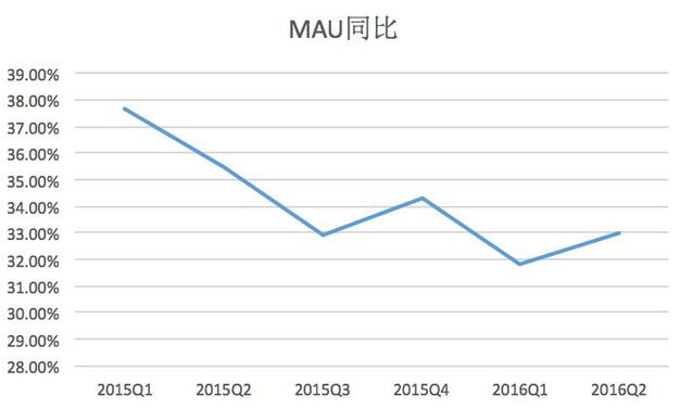 主要體現(xiàn)在銷售、治理及行政用度這一項(xiàng)中。Twitter這一塊開(kāi)支連續(xù)兩年都占據(jù)了營(yíng)收的一半,而微博則較為克制。 這可能是影響利潤(rùn)的因素之一。說(shuō)白了,Twitter的職員開(kāi)支占比比較大。 但這好像很難去解釋為什么Twitter的活躍用戶量一直得不到快速的增長(zhǎng)。 把Facebook的MAU季同比增長(zhǎng)數(shù)據(jù)加入后,可以得到如下這張圖: