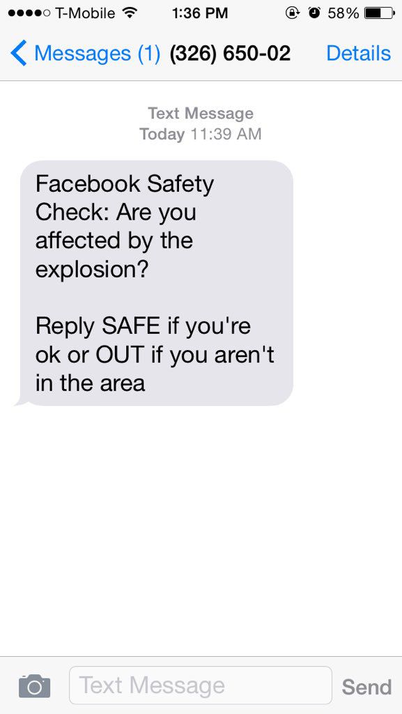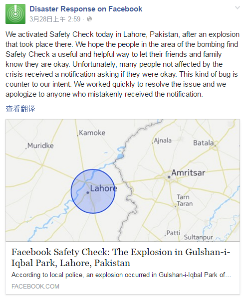 (圖片來源:推特) 可是當(dāng)戴爾先生慌忙望向窗外,卻只見天空晴朗,街道上行人自若,哪有半點(diǎn)失事了的痕跡?類似的短信也發(fā)到了印度等國家Facebook用戶的手機(jī)上,用戶之間廣泛傳播,一時間人心惶惶。 事實(shí)上,這是在當(dāng)天巴基斯坦發(fā)生爆炸事件后,F(xiàn)acebook啟用平安信使功能,將通知發(fā)送給受到波及的地區(qū)用戶,讓他們在Facebook上向親朋摯友報個平安。但由于程序錯誤,這則信息被發(fā)送到了遠(yuǎn)在美國、歐洲、東亞的用戶,不明真相的用戶接到提醒后,造成了小規(guī)模的恐慌。 烏龍事件在推特等社交網(wǎng)絡(luò)上引發(fā)燒議,有用戶批評Facebook是在添亂。Facebook官方也在晚些時候發(fā)出報歉。