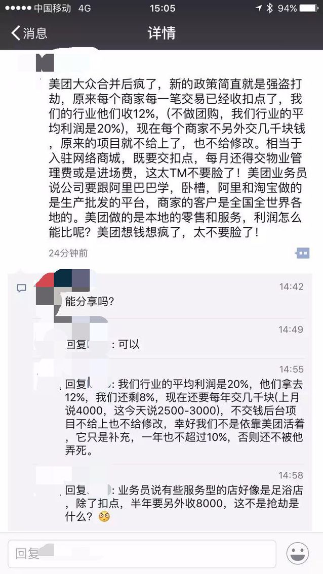 團長君不由迷惑。這豈非是新美大各項業(yè)務(wù)整合尚未完全結(jié)束,就開始從店家嘴里爭食? 回望去年互聯(lián)網(wǎng)領(lǐng)域,合并案風(fēng)氣云涌,但是合并之后,整合之中發(fā)生什么題目,對市場產(chǎn)生了什么樣的實際效應(yīng),外界卻鮮有分析。從近期美團點評合并之后產(chǎn)生出來的種種效應(yīng),我們嘗試著從一個并購案例,看出互聯(lián)網(wǎng)合并對市場產(chǎn)生的各種端倪。 我們先來看看這件“美甲店被強收費”是怎么回事,為了更加客觀地了解事情緣由,首席觀察團獨家采訪了這位美甲店老板。 在當事人的要求下,我們暫且以G先生稱呼他。G先生家的美甲店開在三線城市,每年均勻到店消費的客戶分為老顧客和被美團團購業(yè)務(wù)吸引來的客戶。“我們店開了快十六年,與美團合作是去年一家新店開張時才合作的。實際上,美團帶來的客戶都是很便宜的客戶,成為會員的很少,最優(yōu)質(zhì)和不亂的客戶都不是美團帶來的。美團的客戶主要是圖便宜,客質(zhì)事實上是很差的。與美團合作,我們主要是為了鋪客量。” G先生表示,整個美甲行業(yè)的均勻利潤率是20%,百分之八十的同行在這兩年利潤下降都極其嚴峻,美團的新政策無疑讓本來利潤淡薄的美甲行業(yè)更加雪上加霜。“兩家合并后,收12%的抽成,這本身就不公道。” G先生頗無奈地說,“大約十天左右前,新美大溘然來了撥新的業(yè)務(wù)員,跟我講要抽取每年4000元的用度。這幾天又來催我,交2000元。假如不交,店面在網(wǎng)站上的信息就不予更改調(diào)整。”G先生表示,這太令人生氣了。“十幾二十塊錢的團購生意,還被剝這么多層皮,我們整個行業(yè)還要不要活了?!” 截止到團長君聯(lián)系G先生,他表示可能因為朋友圈施展的影響力,新美大的人打電話過來了解了情況,并把網(wǎng)站上拖了半個月不給修改的店面信息修改了。但用度仍是照收不誤。 實際上,涉及新美大壟斷的相關(guān)事件一直被多行業(yè)職員爆料吐槽。 今年1月,武漢爆發(fā)KTV行業(yè)對新美大的集體抵制。