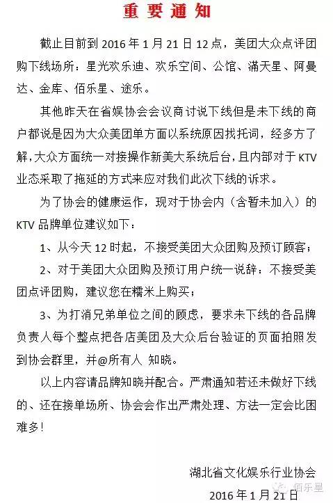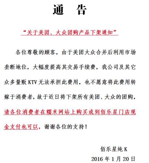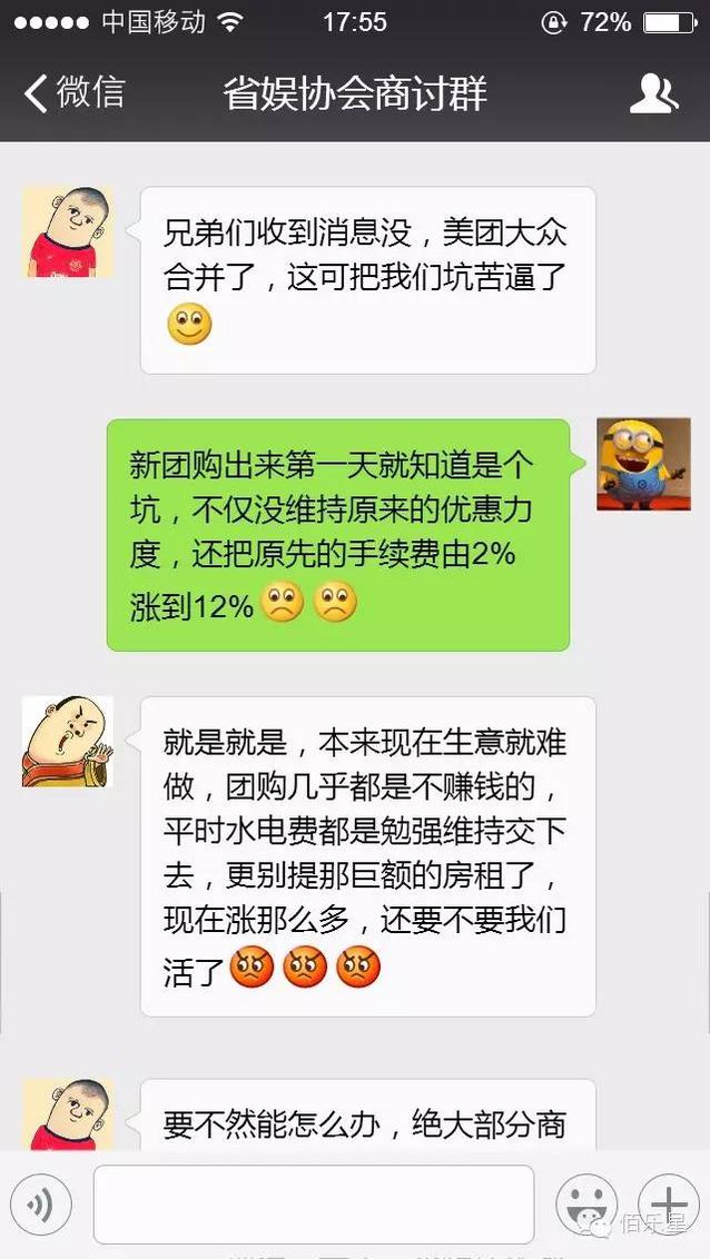 動靜是從一個名為“省娛協(xié)會商討群”的微信聊天截圖爆出來的,當事者為武漢KTV商家表示,新美大合并后,將原來的手續(xù)費由2%漲到12%,商家在討論群里集體表示,在團購的影響下,業(yè)務(wù)利潤已經(jīng)很低了,再多收取抽成點,獲得收益甚至不足以支撐基本糊口。