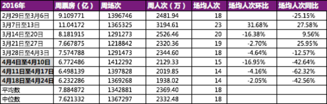 五一檔昨日(4月29日)拉開帷幕,在迎接新一輪的市場熱浪前,相信絕大部門行業(yè)觀察人士和片子興趣者都已經(jīng)留意到內(nèi)地影市在過去60天里所感慨感染到的刺骨寒意。 自三月中旬以來,內(nèi)地影市周票房已經(jīng)六連跌,由3月14日至3月20日的11.04億幾乎被腰斬到了4月18日至4月24日的6.23億。盡管在清明假期前(3月28日至4月3日),《蝙蝠俠大戰(zhàn)超人》和《我的特工爺爺》《火鍋英雄》的接踵上映給影院經(jīng)理們注入了一劑強心劑,止住了周場次的下滑趨勢,并在隨后顯著被影院經(jīng)理拉升到了141萬場(4月4日至4月10日),但觀眾反應(yīng)依然冷淡,周人次受清明三天假期影響,小幅晉升后旋即頭也不回地一路下探,與影院經(jīng)理們的夸姣愿望背道而馳。 對影院經(jīng)理們而言,令人寒心的數(shù)據(jù)遠不止于此,自三月中旬后的六周時間里,不僅場均人次環(huán)比連續(xù)負增長,而且與去年同期比擬,4月4日后的連續(xù)三周,場均人次同比更是均以40%以上的速度下墜。