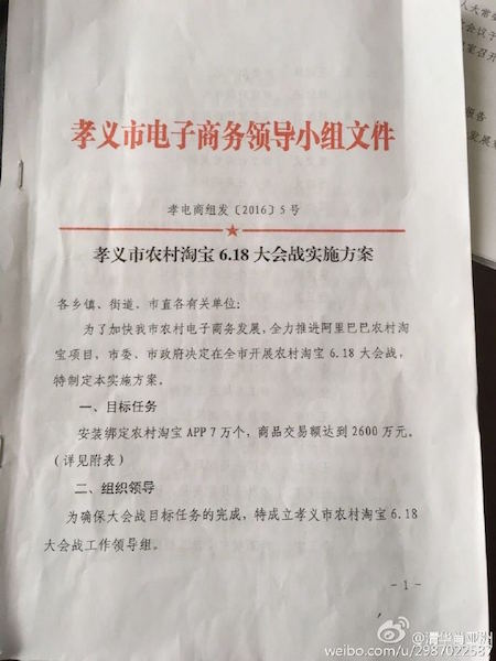 當(dāng)前,競爭日趨慘烈的“6.18”大戰(zhàn)終于落下帷幕,各大電商平臺(tái)紛紛曬出自己的“成績單”。根據(jù)農(nóng)村淘寶宣布的數(shù)據(jù),家電類產(chǎn)品在今年618期間銷量最佳,農(nóng)村淘寶好像已儼然成為家電數(shù)碼產(chǎn)品下鄉(xiāng)的主陣地。 然而,在阿里村淘看似繁榮的營銷數(shù)據(jù)背后,卻躲藏著行政干涉干與這只怪手。據(jù)傳,山西孝義市近期就發(fā)布了一份令人咋舌的文件,要求下級(jí)單位配合完成阿里村淘6.18交易額等指標(biāo)。 一、為推進(jìn)阿里村淘項(xiàng)目,孝義市強(qiáng)制向下攤派消費(fèi)指標(biāo) 日前,網(wǎng)絡(luò)上曝出一份山西省孝義市電子商務(wù)領(lǐng)導(dǎo)小組下發(fā)的紅頭文件,引來網(wǎng)友的廣泛關(guān)注和吐槽。文件內(nèi)容顯示,該市要求下級(jí)單位完成農(nóng)村淘寶在6.18期間的APP安裝量和交易額指標(biāo)。 詳細(xì)來看,孝義市擬定在2016年6月1日至19日期間,完成“安裝綁定農(nóng)村淘寶APP 7萬個(gè),商品交易額達(dá)到2600萬元”的目標(biāo)任務(wù)。為此,孝義市將指標(biāo)細(xì)化后,對市委、宣傳部等機(jī)關(guān)及企事業(yè)單位下發(fā)了明確的任務(wù)指標(biāo),甚至轄下的各鄉(xiāng)鎮(zhèn)、礦區(qū)和學(xué)校都被分配了上百、上千的APPA綁定任務(wù)。 同時(shí),孝義市要求各鄉(xiāng)鎮(zhèn)、街道和市直有關(guān)單位分別進(jìn)行一條龍排隊(duì),考核成績納入年終責(zé)任制考核。考核依托阿里巴巴公司為大會(huì)戰(zhàn)工作領(lǐng)導(dǎo)組組長、副組長、辦公室主任分別安裝后臺(tái)APP治理系統(tǒng),隨時(shí)把握各單位任務(wù)目標(biāo)完成情況。