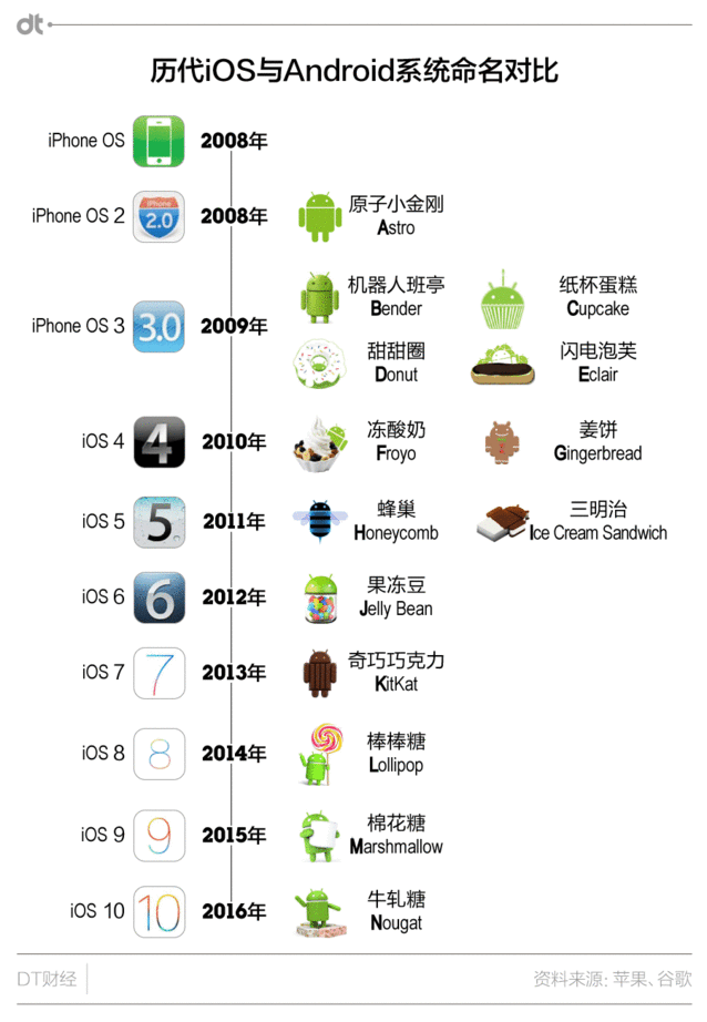好吧,別告訴我你當(dāng)真讀完了。 DT君給不喜歡句讀的你來翻譯一下:這不是iOS所以我并不關(guān)心安卓取什么名字,以及我不分單詞有關(guān)系嗎…… 好的,DT君不是故意要用iOS擁躉來黑安卓黨的,咳咳。因此下面這些信息,足以撫慰安卓黨們受傷的心靈。 移動(dòng)系統(tǒng)命名PK:安卓呆萌小甜心,蘋果板著臉數(shù)數(shù) DT君臆測(cè),泛博蘋果用戶和使用著“改良”過的安卓系統(tǒng)的中國(guó)用戶,對(duì)安卓原生系統(tǒng)的命名方法并不認(rèn)識(shí)。 實(shí)在從2009年5月開始,安卓系統(tǒng)就開始使用甜點(diǎn)來作為版本代號(hào),這些版本按照大寫字母的順序來進(jìn)行命名,目前最新版本輪到了N。在此之前,谷歌曾經(jīng)用過原子小金剛(Astro)和機(jī)器人班亭(Bender)這種不明覺厲的名字,之后就越來越接地氣——不包括最新的牛軋?zhí)堑脑,從C開始安卓已經(jīng)使用了11個(gè)甜品進(jìn)行命名。 谷歌為這些版本都制作了雕塑。但是DT君覺得,看著身穿谷歌T恤的程序員,爭(zhēng)先恐后和甜甜圈、三明治們合影,畫面卻有些詭異。 至于為什么選了這么個(gè)方法進(jìn)行命名,谷歌發(fā)言人沒有給出任何清晰的理由:“這就似乎某種內(nèi)部團(tuán)隊(duì)的事情,我們想做的有點(diǎn)——怎么說——有點(diǎn)神秘。” 這樣的命名風(fēng)格就和這個(gè)安卓機(jī)器人一樣,顯得活潑但又有點(diǎn)“脆弱”,與蘋果對(duì)其移動(dòng)系統(tǒng)IOS的命名比擬,風(fēng)格迥異。下面這張圖,足以說明題目: