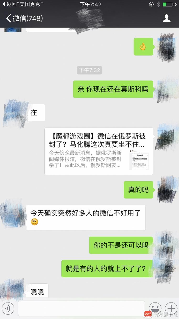 在剛剛,南都記者多方承認,微信在俄羅斯境內(nèi)被封殺。有多名居住在俄羅斯的人士向南都記者表明,從今天下午開端,俄羅斯境內(nèi)不少微信用戶呈現(xiàn)徹底無法登入、運用的狀況。有用戶則表明,微信從今天下午開端間隙性“宕機”,時好時壞。 微信方面剛才也向南都記者承認了這一現(xiàn)實,至于詳細因素,還有待微信方面進一步的音訊。 南都記者與俄羅斯人士對話:下午開端網(wǎng)友陸續(xù)無法運用微信 ![]() ![]() ![]() 俄羅斯網(wǎng)友改用QQ交流: ![]() |