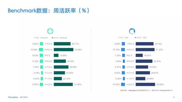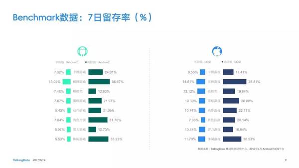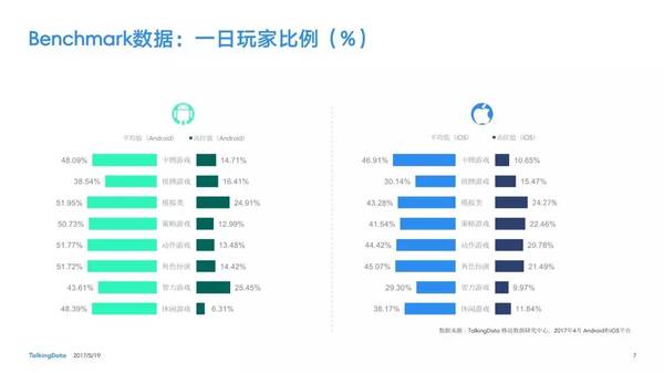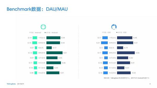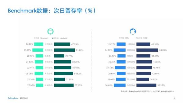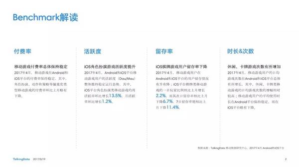 付費(fèi)率:2017年4月,移動(dòng)游戲在Android和iOS渠道的付費(fèi)率保持安穩(wěn),其間,角色扮演、動(dòng)作和戰(zhàn)略等偏重度類(lèi)型移動(dòng)游戲的付費(fèi)率環(huán)比上月略有降低; 用戶(hù)活潑度:2017年4月,Android和iOS渠道移動(dòng)游戲用戶(hù)的活潑度(Dau/Mau)全體保持安穩(wěn)運(yùn)轉(zhuǎn)態(tài)勢(shì),其間,iOS渠道角色扮演類(lèi)移動(dòng)游戲的周活潑率環(huán)比增加13.5%,月活潑率環(huán)比增加1.2%; 用戶(hù)留存率:2017年4月,移動(dòng)游戲用戶(hù)在Android和iOS渠道的用戶(hù)留存狀況有升有降;iOS渠道棋牌類(lèi)移動(dòng)游戲的一日玩家份額比較上月增加2.2%,而其次日留存率比較上月降低6.7%,7日留存率則比較上月降低11.4%; 運(yùn)用時(shí)長(zhǎng)&次數(shù):2017年4月,移動(dòng)游戲用戶(hù)的日均游戲次數(shù)在Android和iOS渠道整體有所增加,其間,休閑、卡牌類(lèi)移動(dòng)游戲的日均游戲次數(shù)的增幅相對(duì)較高;移動(dòng)游戲用戶(hù)的均勻運(yùn)用時(shí)長(zhǎng)在Android渠道保持安穩(wěn),而在iOS渠道略有降低。 |