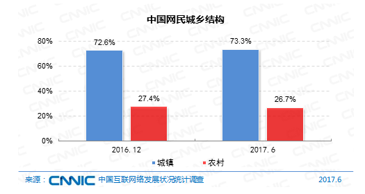 在城鄉(xiāng)結(jié)構(gòu)上,我國(guó)網(wǎng)民中農(nóng)村網(wǎng)民占比26.7%,規(guī)劃為2.01億;鄉(xiāng)鎮(zhèn)網(wǎng)民占比73.3%,規(guī)劃為5.50億,較2016年末添加1988萬(wàn)人,半年增幅為3.7%。