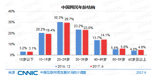 在年紀(jì)構(gòu)成上,我國(guó)網(wǎng)民仍以10-39歲集體為主,占全體的72.1%:其間20-29歲年紀(jì)段的網(wǎng)民占比最高,達(dá)29.7%,10-19歲、30-39歲集體占比別離為19.4%、23.0%。與2016年末比較,40歲及以上中高齡集體占比添加1.7個(gè)百分點(diǎn),互聯(lián)網(wǎng)繼續(xù)向這個(gè)年紀(jì)集體浸透。