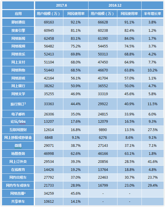 2017年上半年,我國(guó)個(gè)人互聯(lián)網(wǎng)運(yùn)用堅(jiān)持快速開(kāi)展,其間網(wǎng)上外賣(mài)和互聯(lián)網(wǎng)理財(cái)是添加最快的兩個(gè)運(yùn)用,半年添加率別離為41.6%和27.5%,網(wǎng)絡(luò)購(gòu)物仍堅(jiān)持較快添加,半年添加率為10.2%;手機(jī)運(yùn)用方面,手機(jī)外賣(mài)、手機(jī)在線教育課程用戶(hù)規(guī)劃添加最為顯著,半年添加率別離為41.4%和22.4%。