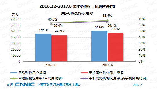 到2017年6月,我國(guó)網(wǎng)絡(luò)購(gòu)物用戶(hù)規(guī)劃到達(dá)5.14億,相較2016年末添加10.2%,其間,手機(jī)網(wǎng)絡(luò)購(gòu)物用戶(hù)規(guī)劃到達(dá)4.80億,半年添加率為9.0%,運(yùn)用份額由63.4%增至66.4%。