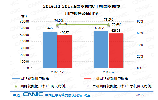 到2017年6月,我國(guó)網(wǎng)絡(luò)視頻用戶(hù)規(guī)劃達(dá)5.65億,較2016年末添加2026萬(wàn)人,添加率為3.7%;網(wǎng)絡(luò)視頻用戶(hù)運(yùn)用率為75.2%,較2016年末提高0.7個(gè)百分點(diǎn)。其間,手機(jī)視頻用戶(hù)規(guī)劃為5.25億,與2016年末比較添加2536萬(wàn)人,添加率為5.1%;手機(jī)網(wǎng)絡(luò)視頻運(yùn)用率為72.6%,比較2016年末添加0.7個(gè)百分點(diǎn)。