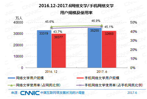 到2017年6月,網(wǎng)絡(luò)文學(xué)用戶(hù)規(guī)劃到達(dá)3.53億,較去年末添加1936萬(wàn),占網(wǎng)民全體的46.9%,其間手機(jī)網(wǎng)絡(luò)文學(xué)用戶(hù)規(guī)劃為3.27億,較去年末添加2291萬(wàn),占手機(jī)網(wǎng)民的45.1%。
