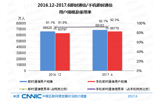 到2017年6月,即時(shí)通訊用戶(hù)規(guī)劃到達(dá)6.92億,較2016年末添加2535萬(wàn),占網(wǎng)民全體的92.1%。其間手機(jī)即時(shí)通訊用戶(hù)6.68億,較2016年末添加2981萬(wàn),占手機(jī)網(wǎng)民的92.3%。