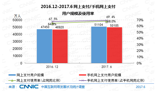 到2017年6月,我國(guó)運(yùn)用網(wǎng)上付出的用戶(hù)規(guī)劃到達(dá)5.11億,較2016年12月,網(wǎng)上付出用戶(hù)添加3654萬(wàn)人,半年添加率為7.7%,我國(guó)網(wǎng)民運(yùn)用網(wǎng)上付出的份額從64.9%提高至68.0%。其間,手機(jī)付出用戶(hù)規(guī)劃添加迅速,到達(dá)5.02億,半年添加率為7.0%,網(wǎng)民手機(jī)網(wǎng)上付出的運(yùn)用份額由67.5%提高至69.4%。