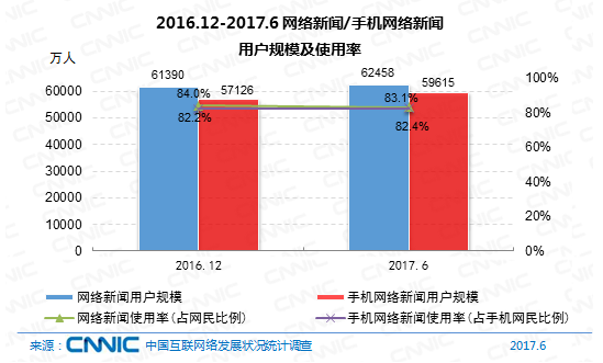 到2017年6月,我國(guó)網(wǎng)絡(luò)新聞?dòng)脩?hù)規(guī)劃為6.25億,半年添加率為1.7%,網(wǎng)民運(yùn)用份額為83.1%。其間,手機(jī)網(wǎng)絡(luò)新聞?dòng)脩?hù)規(guī)劃到達(dá)5.96億,占手機(jī)網(wǎng)民的82.4%,半年添加率為4.4%。