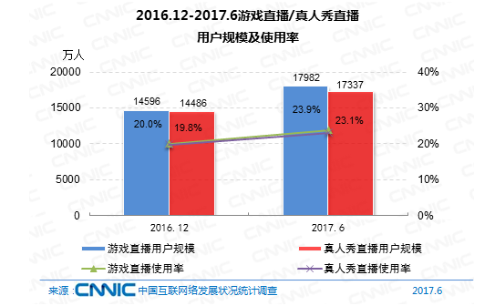 別的值得注意的是,到2017年6月,網(wǎng)絡(luò)直播用戶(hù)共3.43億,占網(wǎng)民全體的45.6%;而到2016年12月,網(wǎng)絡(luò)直播用戶(hù)規(guī)劃到達(dá)3.44億,占網(wǎng)民全體的47.1%。與半年前比較,網(wǎng)絡(luò)直播的用戶(hù)規(guī)劃和在網(wǎng)民中的全體占比皆呈現(xiàn)下降。
