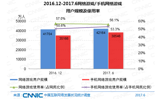 到2017年6月,我國(guó)網(wǎng)絡(luò)游戲用戶(hù)規(guī)劃到達(dá)4.22億,較去年末添加460萬(wàn),占全體網(wǎng)民的56.1%。手機(jī)網(wǎng)絡(luò)游戲用戶(hù)規(guī)劃為3.85億,較去年末添加3380萬(wàn),占手機(jī)網(wǎng)民的53.3%。