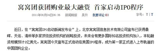 文\X教授(微信公家號:X_Man_Investment) 在大眾創(chuàng)業(yè)的背景下,初創(chuàng)企業(yè)A輪百萬、B輪C輪數(shù)千萬美金的融資新聞,已經(jīng)不能在科技媒體上吸引眼球與流量了。每隔幾天,就會有此前默默無聞的公司公布進行金額聞所未聞的融資。有趣的是創(chuàng)投界的神話,往往會自我祛魅和揭穿。 虛假融資成風有強烈的內(nèi)在邏輯驅(qū)動。游戲介入方甚至能得到皆大歡喜的局面。對創(chuàng)業(yè)者而言,浮夸的數(shù)額吸引眼球,能夠成為免費的公關流動,利便拉人入伙、市場拓展乃至遏制競爭對手。 對投資者而言,包裝出來的“欣欣茂發(fā)”態(tài)勢,利便擊鼓傳花的資本游戲進行下去。易凱資本創(chuàng)始人兼首席執(zhí)行官王冉,在一次演講中就說過:“一家公司融了3000萬美元,然后新聞報出來就是8000萬美元,融了1億美元報出來可能是3億美元。那既然你這么做了,他的競爭對手看到了,通常競爭對手也會采用同樣的方式。由于做乘法并不難,乘以2、乘以3基本就可以了,然后圈里知道都會這么做,又會除歸來,所以除法也并不難。” 未上市企業(yè)因不需要向公家表露企業(yè)信息,還能繼承講故事虛報融資;而一旦謀劃上市,遞交包含招股書在內(nèi)的諸多文件,過去所有的融資真實情況就會暴露,尤以美股市場為甚。 只需要簡樸的英文能力,詳閱招股書,便能發(fā)現(xiàn)此間的蹊蹺。進入筆者視野的五家公司,固然間隔上市之初過去了許久,且不乏洗白成功登堂入室者,但恰是作惡者的上行下效,現(xiàn)在虛報融資額之風才越刮越烈,這也是“算舊賬”的意義所在。 有上市潛力的優(yōu)質(zhì)創(chuàng)業(yè)者介入融資數(shù)額造假游戲,最為愚蠢。由于假如公司做的好,很快就會下一輪融資,而一輪要比一輪融資規(guī)模大,因此假話將一個接著一個,最后進行證券登記時,假話難圓。 出來混早晚是要還的,筆者收拾整頓的五家互聯(lián)網(wǎng)企業(yè):狂風科技、智聯(lián)招聘、唯品會、歡聚時代、窩窩團。有的正在遭遇訴訟,有的在被徐徐遺忘,有的雖有可稱為“傳奇”的成功,但未來將如A股走勢般兇險。 第一名: 窩窩團融資額翻4倍報道融資額:2億美元 真實融資額:5500萬美元 2011年5月,窩窩團高調(diào)公布首輪融資將達2億美元,是當年團購業(yè)內(nèi)單筆融資的最大規(guī)模,融資方為鼎暉、天助、清科等。 以下為媒體報道截圖: