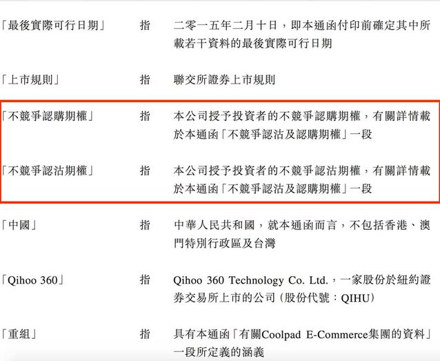 360和酷派正在經(jīng)歷著一場(chǎng)明爭(zhēng)冷戰(zhàn),跟著上周360祭出要求酷派以14.85億美元認(rèn)沽奇酷公司期權(quán)這個(gè)殺招后,兩家的關(guān)系徹底撕破,也開始了互相扯皮的口水戰(zhàn)。這邊酷派稱360沒有履行合約內(nèi)容,360則發(fā)布聲明稱酷派違背了競(jìng)爭(zhēng)協(xié)議,一時(shí)間到底誰說謊了呢?包括價(jià)值兄在內(nèi)的各位,想必都想直到背后的真相到底是什么吧。價(jià)值兄這里拿到了當(dāng)時(shí)360與酷派合作時(shí)候簽署的協(xié)議的全部?jī)?nèi)容,獨(dú)家還原兩家當(dāng)初還甜美如初戀的公司,為什么會(huì)走向不共戴天的地步。 焦點(diǎn)一:14.85億美元認(rèn)沽權(quán)到底該不該得到支持 上周360發(fā)布聲明稱,酷派違背同業(yè)競(jìng)爭(zhēng)協(xié)議,360決定行使相關(guān)認(rèn)沽期權(quán),將其所持有的全部股權(quán)按市場(chǎng)價(jià)的兩倍出售給酷派公司,即要求酷派以兩倍的價(jià)格回購360所持有的49.5%的奇酷科技股權(quán)(價(jià)值7.425億美元),總金額為14.85億美元。面臨市值僅6.68億美元(截至2015年9月11日收盤,酷派市值51.80億港幣)的酷派,可謂難于登天。 那么到底360和酷派簽署的協(xié)議是怎么劃定的呢??jī)r(jià)值兄這里獨(dú)家拿到了協(xié)議的全文,第一時(shí)間提供應(yīng)各位查閱(如下圖)。 圖1-2是酷派和360簽署的的股東,可以看出來,酷派團(tuán)體與360在2015年2月12日簽署了這份協(xié)議,已經(jīng)在圖4的香港有關(guān)部分公然表露,完全具備法律效力。