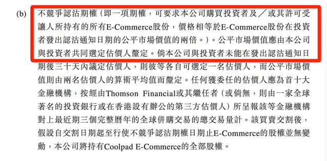 圖4 那么360和酷派的“認(rèn)沽權(quán)”是怎么劃定的呢?可以看出,假如雙方劃定了兩種方式“不競(jìng)爭(zhēng)認(rèn)購期權(quán)”和“不競(jìng)爭(zhēng)認(rèn)沽期權(quán)”(圖5),并且分別劃定了相應(yīng)的權(quán)利和義務(wù)(圖6-圖8),尤其是圖7,非常具體的劃定了假如違背“不競(jìng)爭(zhēng)認(rèn)沽期權(quán)”的內(nèi)容,即酷派不得直接或間接于中國或美國“在與受限制業(yè)務(wù)相同或相似或與之競(jìng)爭(zhēng)的任何業(yè)務(wù)中擁有任何權(quán)益、治理、控制、介入、咨詢、提供服務(wù)或以其他方式從事,或從事協(xié)助”,而眾所周知的是,2015年6月28日,酷派發(fā)布的《控股股東出售股份公告》顯示,郭德英家族通過信托計(jì)劃持股的Data Dreamland以3.508港元每股的對(duì)價(jià)向樂視聯(lián)系關(guān)系公司出售7.8038億股,占已發(fā)行總股本的18%,后者曾經(jīng)推出了多款手機(jī)產(chǎn)品,與360、酷派合資的奇酷科技的業(yè)務(wù)線重疊嚴(yán)峻,顯然,酷派這是演了一出“一女嫁二夫”的小算盤,但是卻健忘了當(dāng)初與360簽署的協(xié)議,以及必需履行的義務(wù)。