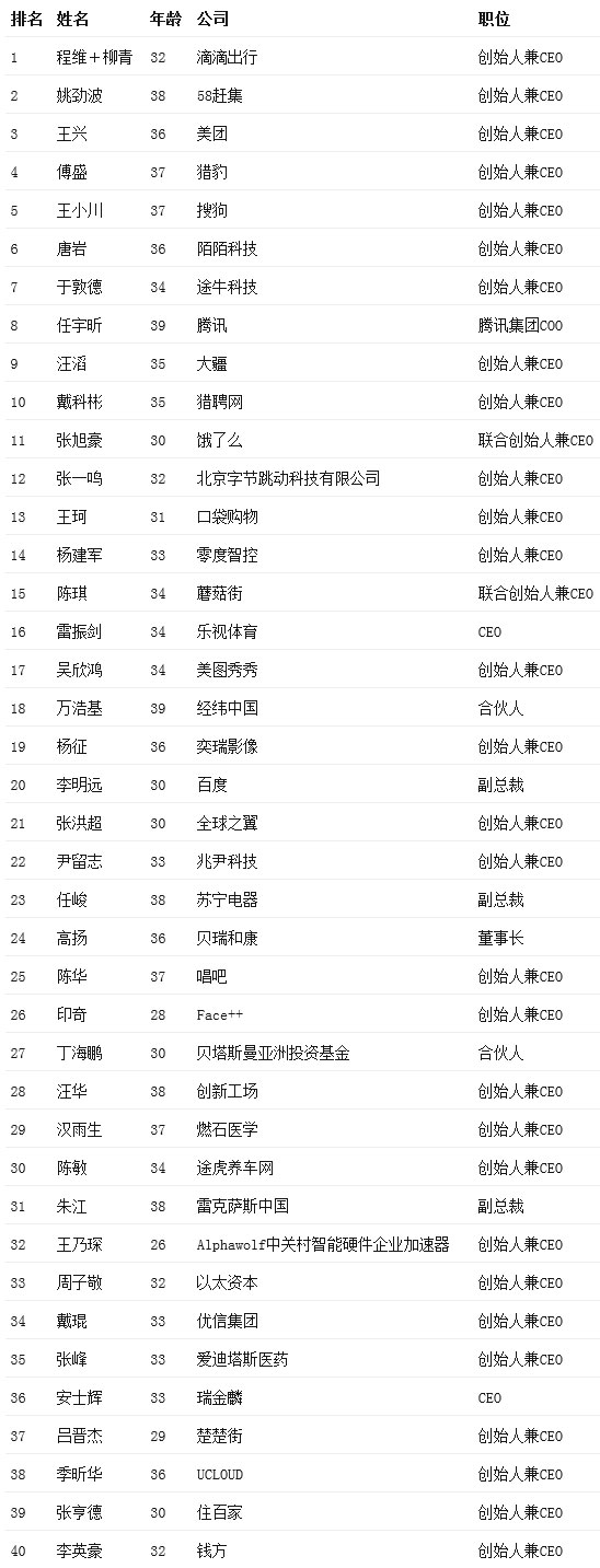 北京時間11月2日晚間動靜,《財富》(中文版)本日正式宣布2015年"中國40位40歲以下的商界精英"榜單。 其中滴滴出行CEO程維、總裁柳青并列榜首,58同城創(chuàng)始人兼CEO姚勁波和美團創(chuàng)始人兼CEO王興分列第二、三。 2015年榜單中,滴滴快的CEO程維(32歲)、總裁柳青(37歲)首次登頂,在《財富》雜志收拾整頓的"獨角獸"(即估值10億美元以上的未上市公司)輿圖上,滴滴快的占據(jù)了很顯眼的位置;14年創(chuàng)辦3家公司的連續(xù)創(chuàng)業(yè)者,58趕集創(chuàng)始人兼CEO姚勁波(38歲)位列亞軍;美團創(chuàng)始人兼CEO王興(36歲)進入榜單前三甲;獵豹創(chuàng)始人兼CEO傅盛(37歲)、搜狗創(chuàng)始人CEO王小川(37歲)分別位列第四、五名。 今年榜單新上榜者超過20位。一些新興行業(yè)逐漸受到創(chuàng)業(yè)者關注,包括創(chuàng)立短租平臺的住百家創(chuàng)始人兼CEO張亨德(30歲)、出產無人機的深圳市大疆立異科技有限公司創(chuàng)始人兼CEO汪滔(35歲)等。 多位新上榜的年青企業(yè)家以技術等核心上風,在各自的領域嶄露頭角。今年30歲及30歲以下的上榜者達7位,其中最年青的是中關村智能硬件企業(yè)加速器的創(chuàng)始人兼CEO王乃琛,年僅26歲。 今年是《財富》(中文版)第五次發(fā)布"中國40位40歲以下的商界精英"榜單。該排行榜在中國推出之時,榜單就已確立了明確的尺度:(1)截止3月份之前,春秋必需小于40歲(不包括40歲);(2)上榜者所從事的事業(yè)具有巨大的貿易遠景,有改變行業(yè)格式的潛力;(3)是要求所有上榜者的事業(yè)不能繼續(xù)自家族,而是必需由他們自己創(chuàng)辦。(無雙) 以下為完整榜單: ![]() |