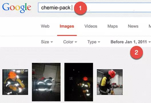 使用images.google.com,鍵入Chemie-pack (1),檢索日期設(shè)置在2011年1月(2)以前。得到的結(jié)果有數(shù)百?gòu)垐D片,這些圖片是大火發(fā)生前幾天,去工廠參觀的集團(tuán)發(fā)布的。 在一些圖片中,你可以看到化學(xué)藥品和它們的名字。通過(guò)這些圖片我們可以確定大火前工廠里儲(chǔ)存的一些化學(xué)品。 在這個(gè)例子中,你通過(guò)Google搜索到的大部門(mén)圖片已經(jīng)被上傳的用戶(hù)刪除了。假如不使用Google,你將無(wú)法看到它們。 特別建議:假如想按照日期來(lái)查閱Google的索引信息, 1.使用搜索工具Search Tools->Custom Range and type 1/1/1000 2.按照日期進(jìn)行排序。