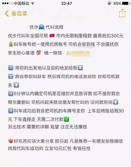 (代叫滴滴快車(chē),10公里5元。) 而且有些叫車(chē)賬號(hào)里并沒(méi)有那么多錢(qián),所以,就會(huì)泛起文章開(kāi)頭那個(gè)司機(jī)師傅講的那個(gè)情況,無(wú)人付款,無(wú)人應(yīng)答。。。 而這些不法分子,就是通過(guò)這個(gè)手段,把盜來(lái)的賬號(hào)變現(xiàn)的。 雖熱對(duì)你來(lái)說(shuō),占點(diǎn)小便宜,可能真特么是件好事。。。但,有知己的你,請(qǐng)千萬(wàn)不要這么做。 這些代叫服務(wù)提供者,把握了大量的優(yōu)步賬號(hào),還有作案工具。