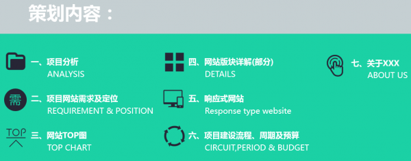 一般我們?cè)诤涂蛻粽劸W(wǎng)站開發(fā)建設(shè)項(xiàng)目的時(shí)候,對(duì)方通常都會(huì)要求我們提供一份網(wǎng)站開發(fā)建設(shè)方案。固然在項(xiàng)目接洽過程中有談到某些開發(fā)建設(shè)方面的內(nèi)容,但是一份書面的方案提供仍是很有必要的。這不僅利便于客戶更加仔細(xì)地了解我們提供的服務(wù)和開發(fā)建設(shè)流程,還有利于客戶治理層之間的項(xiàng)目溝通探討,為雙方之間的項(xiàng)目確定提供指導(dǎo)性文件。常見的方案都是以PPT形式展現(xiàn)的,PPT的好處就是展現(xiàn)形式豐碩多樣,給人的感覺直觀且信息量大,易于理解。PPT方案也可采用某些動(dòng)效展示,令某些動(dòng)作交互更加通俗易懂,客戶在閱覽過后心里也更加清晰明白。假如項(xiàng)目不大,當(dāng)然也可以使用WORD來展示,不外小編仍是推薦以PPT形式來展現(xiàn),究竟顯得高端一點(diǎn)。 針對(duì)不同的項(xiàng)目需求有不同的策劃方案,我們做出來的方案一定要貼和客戶需求來編寫,時(shí)刻捉住客戶所需,才能令這篇方案體現(xiàn)應(yīng)有的價(jià)值,而不是抄襲千篇一律的模式。沒有重點(diǎn)的方案,只會(huì)令客戶感到疑惑,得不到客戶想得到的信息,那么繼承的合作也就難以開展下去。 下面讓我們來看看詳細(xì)從何著手來寫一篇優(yōu)質(zhì)的網(wǎng)站建設(shè)策劃方案。 一、預(yù)備工作 俗話說兵馬未動(dòng),糧草先行。我們?cè)陂_始進(jìn)行方案策劃的時(shí)候,一定要提前做好預(yù)備工作。詳細(xì)說來就是把握客戶具體資料,包括客戶所屬行業(yè)特點(diǎn)、網(wǎng)站建設(shè)的需求、客戶對(duì)互聯(lián)網(wǎng)的認(rèn)知度等(利便方案的策劃是否要運(yùn)用專業(yè)術(shù)語仍是淺顯易懂的方式來編寫)。當(dāng)我們知曉這些內(nèi)容后,就可以思量接下來的方案編寫采取哪種形式來展現(xiàn)好。再者,也能讓我們的方案內(nèi)容策劃盡可能地貼近客戶、貼近需求。這一階段的預(yù)備工作是我們必需要做的,除此之外我們還要和公司技術(shù)等相關(guān)職員研討一下針對(duì)客戶的建站要求詳細(xì)是怎么部署的。我們策劃職員的角色就相稱于連接二者的橋梁,當(dāng)然要知曉雙方的信息,這樣策劃出來的方案才能合用于雙方。方案不只是客戶要看,我們內(nèi)部也要參閱的,這點(diǎn)大家需要留意。 這里順便談一點(diǎn),就是PPT要不要使用模板的題目,小編覺得使用模板沒什么不好,當(dāng)然假如能自己設(shè)計(jì)那是最好的。使用現(xiàn)成的PPT,保持版式的條件下修改里面的內(nèi)容,這是一種快速完成方案的方法。假如自己設(shè)計(jì),那么有更多的發(fā)展空間,良多圖片設(shè)計(jì)也能自定義化,適合擁有一定設(shè)計(jì)基礎(chǔ)的策劃者。自己完全獨(dú)立設(shè)計(jì)一篇策劃方案PPT,打從心里也是對(duì)自己的肯定和鼓勵(lì)。所以不用糾結(jié)用了別人的PPT模板,里面的內(nèi)容才是實(shí)質(zhì)性的干貨,是別人復(fù)制不到的精華。 二、策劃方案的編寫 開始編寫策劃方案之前,最好先列個(gè)提綱、打個(gè)草稿,就比如我們寫作文一樣。想好先寫什么、再寫什么,做到心中有數(shù),這樣編寫的方案也有一定的條理順序,便于閱讀理解。下面浪訊科技小編將自己平時(shí)的策劃步驟給大家分享一下,包括以下幾點(diǎn)。 1.首頁展示 策劃案的名稱,策劃案編寫者所屬公司等信息,可適當(dāng)添加。不要求信息量有多大,簡(jiǎn)潔明了就好。如下圖,當(dāng)然配色那些可以按照客戶行業(yè)特征或以科技公司色調(diào)為主,不要太花哨就好。 2.策劃內(nèi)容 這部門展示我們針對(duì)客戶需求所進(jìn)行的大體規(guī)劃,常見的內(nèi)容包括項(xiàng)目分析、網(wǎng)站需求及定位、網(wǎng)站TOP圖、板塊詳解、響應(yīng)式網(wǎng)站特色、項(xiàng)目建設(shè)流程周期及預(yù)算、關(guān)于我們等。詳見下圖
