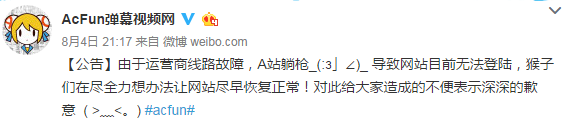 A站2016年8月2日就在官方微博上表示,因?yàn)锳站服務(wù)器暫時(shí)性調(diào)整進(jìn)級(jí),導(dǎo)致網(wǎng)站部門功能瀏覽異常,A站的技術(shù)職員在緊急修復(fù)中,給大家?guī)?lái)的不便表示深深歉意。