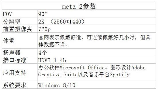 固然AR界老大哥微軟的HoloLens已經(jīng)開始預(yù)售,但同為AR界的另一家美國(guó)初創(chuàng)公司Meta也提前發(fā)售了旗下的AR產(chǎn)品——Meta 2。 和HoloLens一樣,Meta 2是一款增強(qiáng)現(xiàn)實(shí)眼鏡,戴上它就能夠在你的真實(shí)視野里疊加虛擬影像。 參數(shù)方面,Meta 2擁有90度的半透明視野,比HoloLens的視場(chǎng)角要大,二代的投射屏幕分辨率為2560x1440,比擬一代有很大晉升。