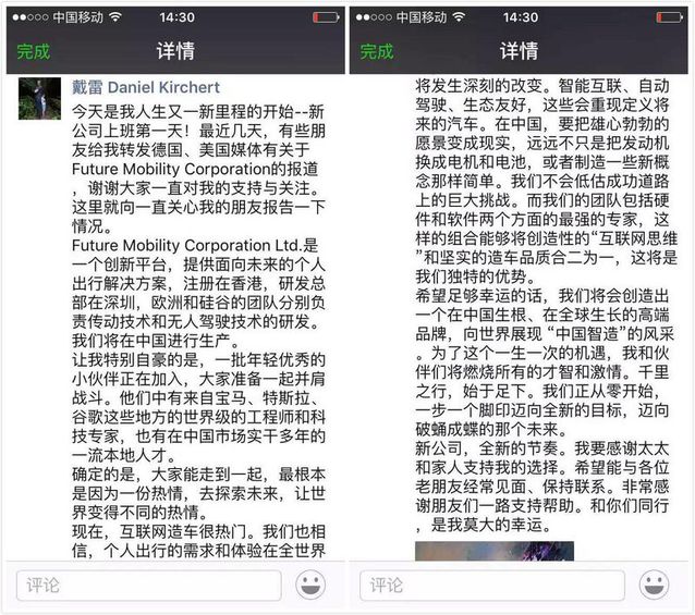 Future Mobility COO 戴雷的朋友圈 目標(biāo)是打造一個高端電動車品牌的 Future Mobility 注冊在香港,研發(fā)總部位于深圳,傳動技術(shù)和無人駕駛技術(shù)的研發(fā)分別放在歐洲和硅谷,將在中國進行整車出產(chǎn)。 和諧富騰旗下電動車項目經(jīng)濟+高真?zhèn)產(chǎn)品組合,很輕易讓人聯(lián)想起車和家、蔚來汽車這兩家電動車創(chuàng)業(yè)公司,他們的車型也分別定位于經(jīng)濟和高端。 從產(chǎn)品角度來看,未來很有可能泛起愛車 vs. 車和家、Future Mobility vs. 蔚來汽車捉對廝殺的競爭局面。