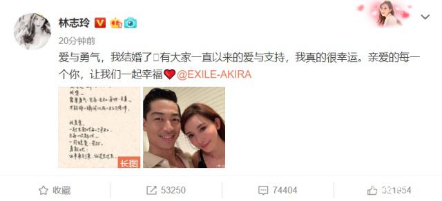 宅男心中的女生志玲姐姐宣告成婚了。“愛與勇氣,我成婚了。有我們一直以來的愛與支持,我真的很走運(yùn)。親愛的每一個你,讓我們一同美好。”
