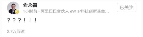 就在楊偉東的新聞爆出后,外界發(fā)現(xiàn)前阿里巴巴集團(tuán)大文娛董事長俞永福發(fā)了一個(gè)狀態(tài),一個(gè)字沒寫,只有三個(gè)問號(hào)和三個(gè)感嘆號(hào)。