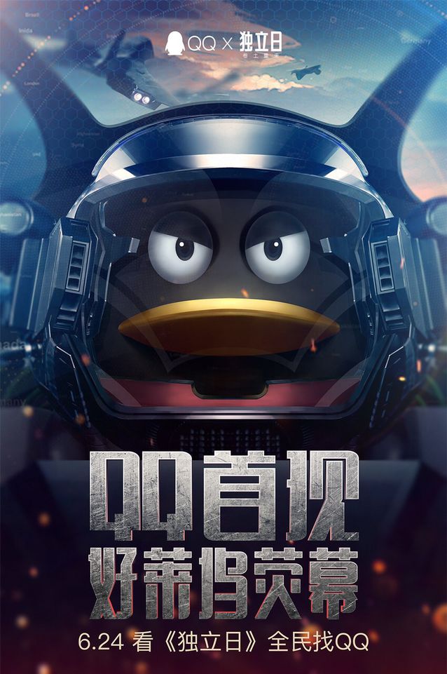 6月24日,時(shí)隔20年重啟的好萊塢科幻災(zāi)害巨片《獨(dú)立日·卷土重來(lái)》登陸中國(guó)大陸院線。影片男女主角進(jìn)行地月通話,結(jié)束時(shí)電腦屏幕顯示QQ企鵝