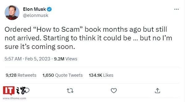 馬斯克發(fā)今日推文稱:“在幾個(gè)月前訂購(gòu)了一本叫做《怎么欺詐》的書,但還沒到,開始覺得它可能是... 不,我相信它很快就會(huì)到了!