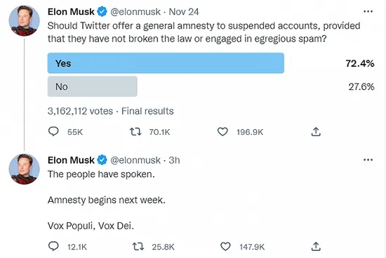 馬斯克正在依照自己的毅力改造Twitter。 近期,馬斯特在Twitter發(fā)起是否康復(fù)美國(guó)前總統(tǒng)特朗普Twitter賬號(hào)的民意查詢,