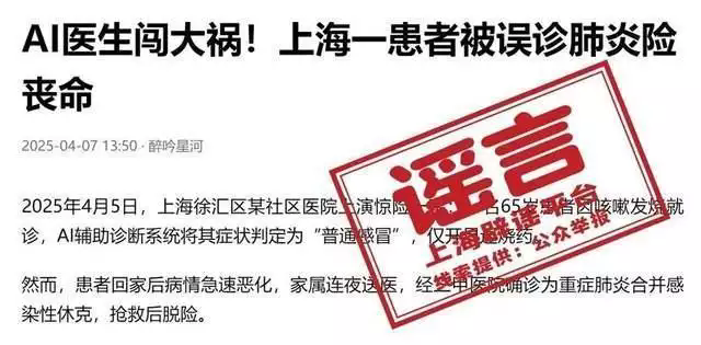 近日 有讀者向上海辟謠平臺(tái)詢問(wèn) 網(wǎng)傳“AI醫(yī)生闖大禍! 上海一患者被誤診肺炎險(xiǎn)喪命”的消息 是不是真的?關(guān)于“上;颊弑籄I誤診喪命獲賠127萬(wàn)”的消息在社交平臺(tái)和部分自媒體上傳播,