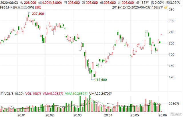 618購物節(jié)閃亮開局,阿里巴巴今早跳空高開4%報208港元,盤前成交3.29億港元,最新總市值44641億港元。隔夜美股阿里巴巴收漲3.76%報214.33美元,