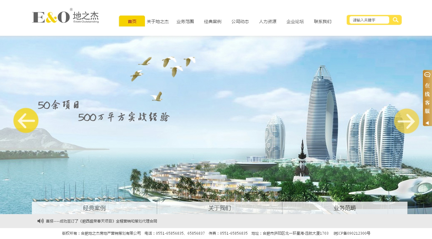 合肥地之杰房地產(chǎn)営銷策劃有限公司成立于2007年.公司自成立以來,始終把自己定位于專業(yè)地產(chǎn)顧問 公司:以合肥立足點(diǎn)專注地為安徴二.三線城市地產(chǎn)商服務(wù).此務(wù)范圍涵兼住宅地產(chǎn),商業(yè)地產(chǎn)以及體育、 休閑、旅游等綜合類地產(chǎn):業(yè)務(wù)領(lǐng)域渉及到前期投資咨詢、開發(fā)顧問、產(chǎn)品規(guī)劃設(shè)計(jì)踴問、銷售代理.銷售回 款廣告策劃與推廣活動(dòng)組織與執(zhí)行,物業(yè)顧問等地產(chǎn)開發(fā)投資十幾個(gè)環(huán)節(jié)•合肥地之杰努力做安徽本 土領(lǐng)先的地產(chǎn)綜合服務(wù)商!