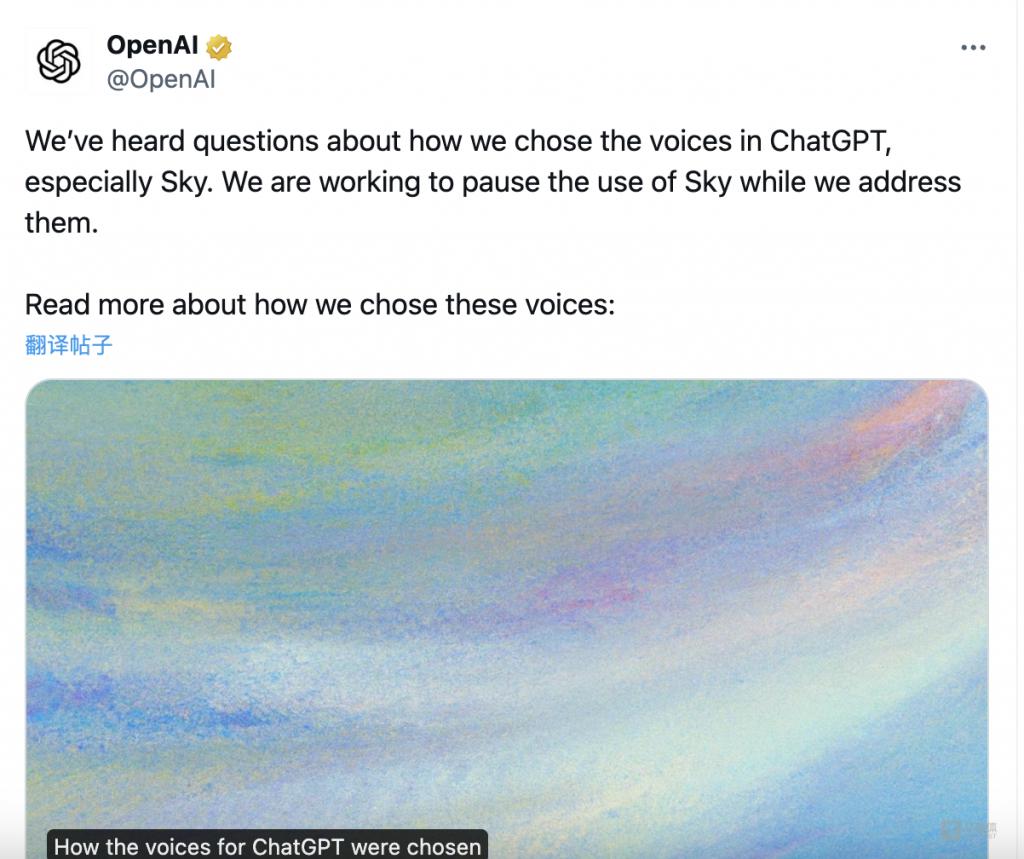 2024年5月20日,OpenAI 宣布暫停其聊天機器人 ChatGPT 的“Sky”語音功能,原因是該語音與知名演員斯嘉麗·約翰遜(Scarlett Johansson)的聲音極為相像,