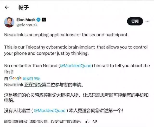 馬斯克宣布,繼年初首個參與腦機設(shè)備植入實驗的患者手術(shù)成功100天后,Neuralink(神經(jīng)連接公司)正式開始招募第二個接受腦機植入的患者。腦機接口技術(shù)是一種在腦與外部設(shè)備之間建立直接的通信渠道的技術(shù)。