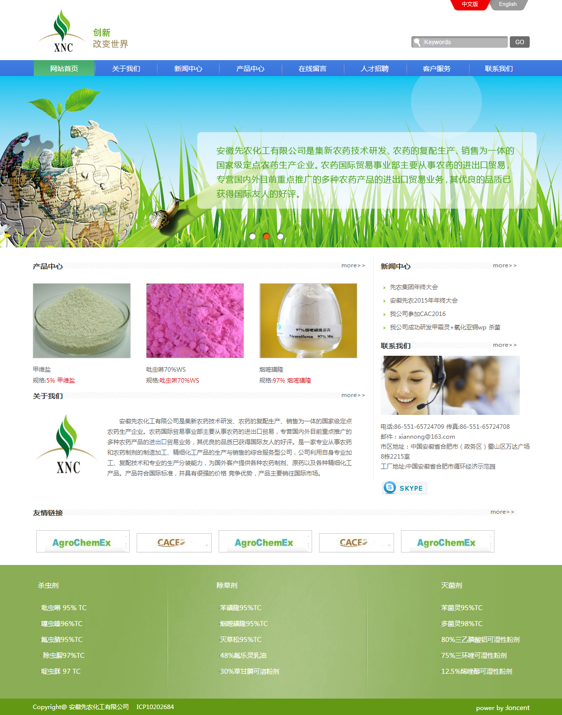 安徽先農(nóng)化工有限公司是集新農(nóng)藥技術(shù)研發(fā)、農(nóng)藥的復(fù)配生產(chǎn)、銷售為一體的國家級定點農(nóng)藥生產(chǎn)企業(yè)。農(nóng)藥國際貿(mào)易事業(yè)部主要從事農(nóng)藥的進出口貿(mào)易,專營國內(nèi)外目前重點推廣的多種農(nóng)藥產(chǎn)品的進出口貿(mào)易業(yè)務(wù),其優(yōu)良的品質(zhì)已獲得國際友人的好評。是一家專業(yè)從事農(nóng)藥和農(nóng)藥制劑的制造加工、精細化工產(chǎn)品的生產(chǎn)與銷售的綜合服務(wù)型公司